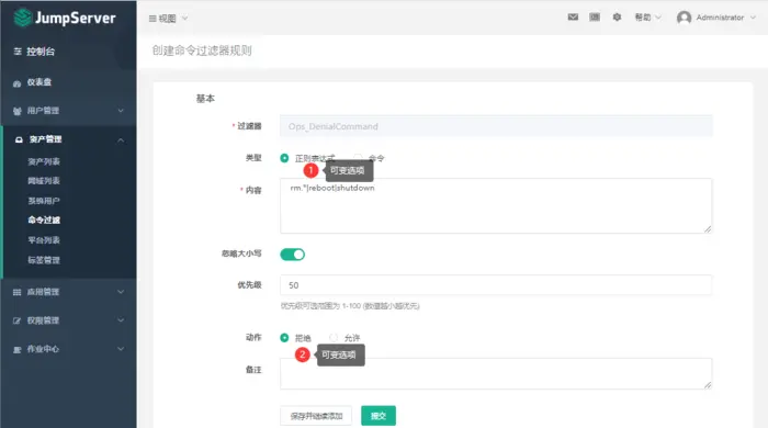 系统用户支持绑定多个命令过滤器实现禁止输入某些命令的效果;过滤器中可配置多个规则,在使用该系统用户连接资产时,输入的命令按照过滤器中配置的规则优先级生效。